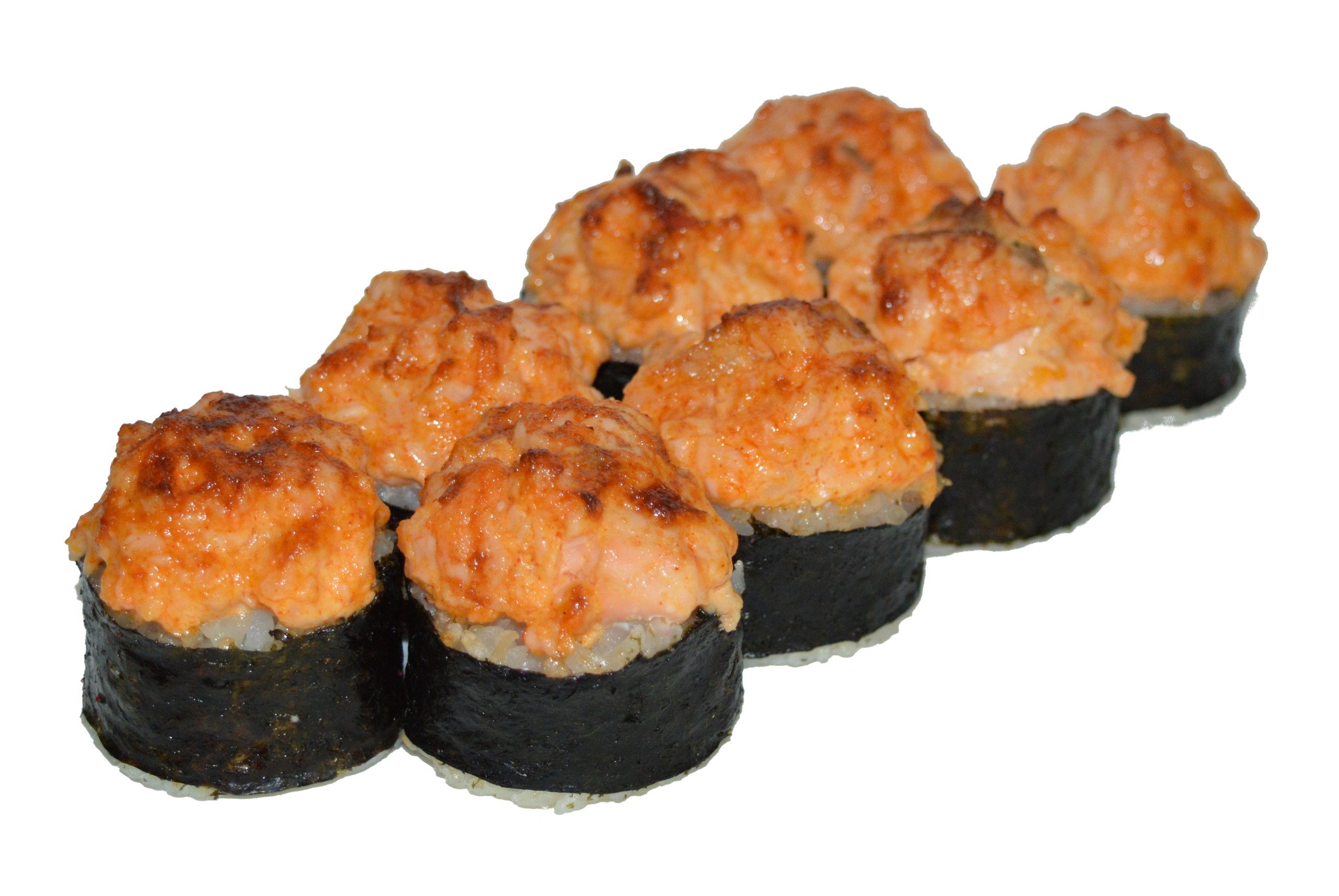 Рис,нори,спайси соус, краб(им), лосось,бекон,паприка, острый соус,сыр "Моцарелла" 245гр.8шт.